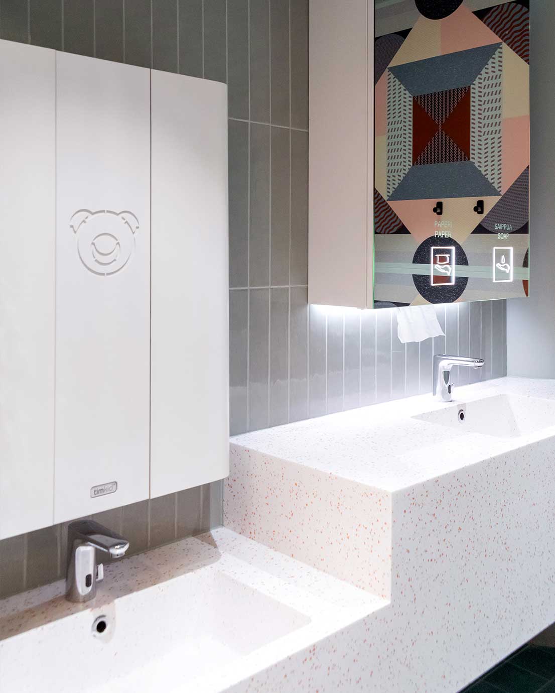 Timkid-seriens skötbord KAWAmidi tillverkas av högtryckslaminerat, formböjt trä och har en mittpanel i metall. Mittpanelen går att få i olika färger och i dess mitt sitter en laseretsad nallefigur på vit botten. Nallefiguren kan i sin tur framhävas med hjälp av en färgad film i olika kulörvarianter.